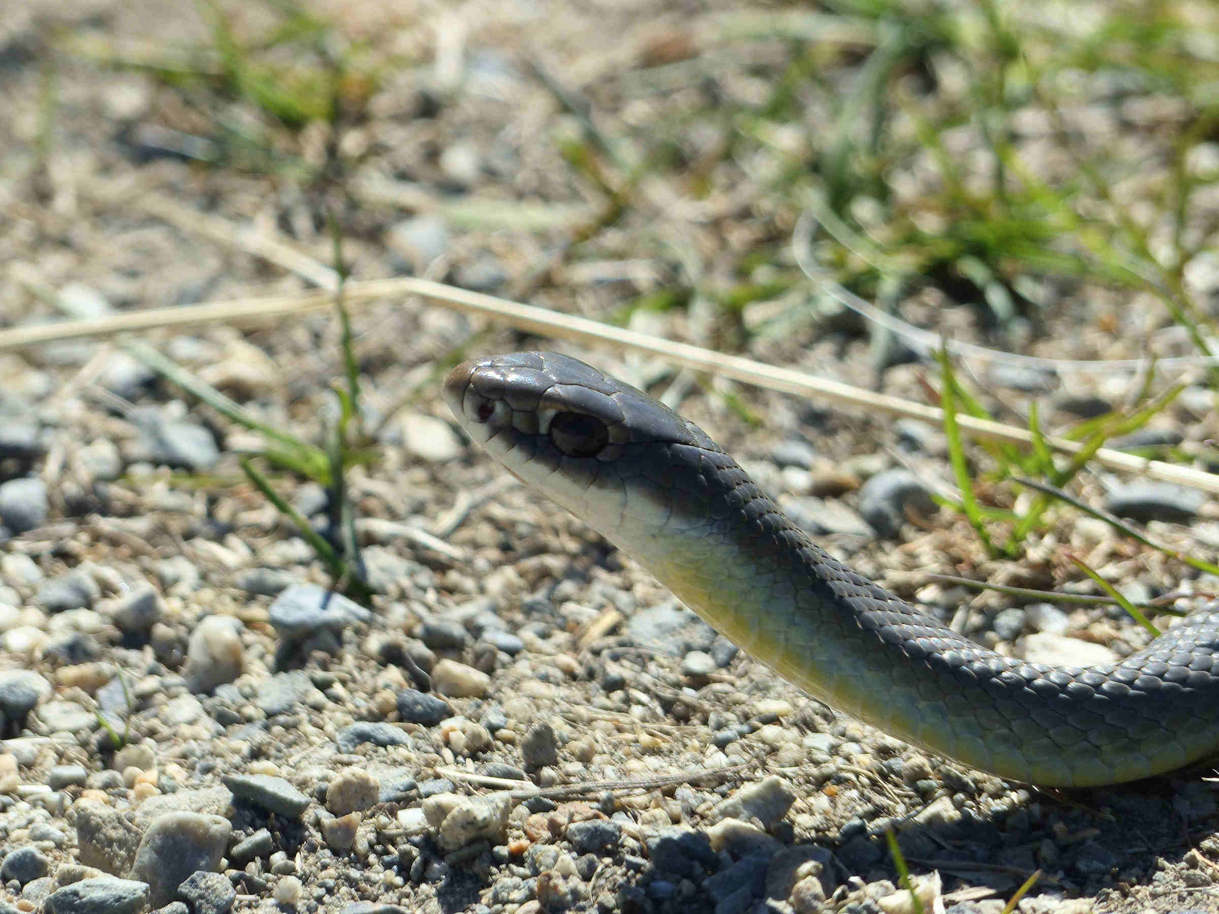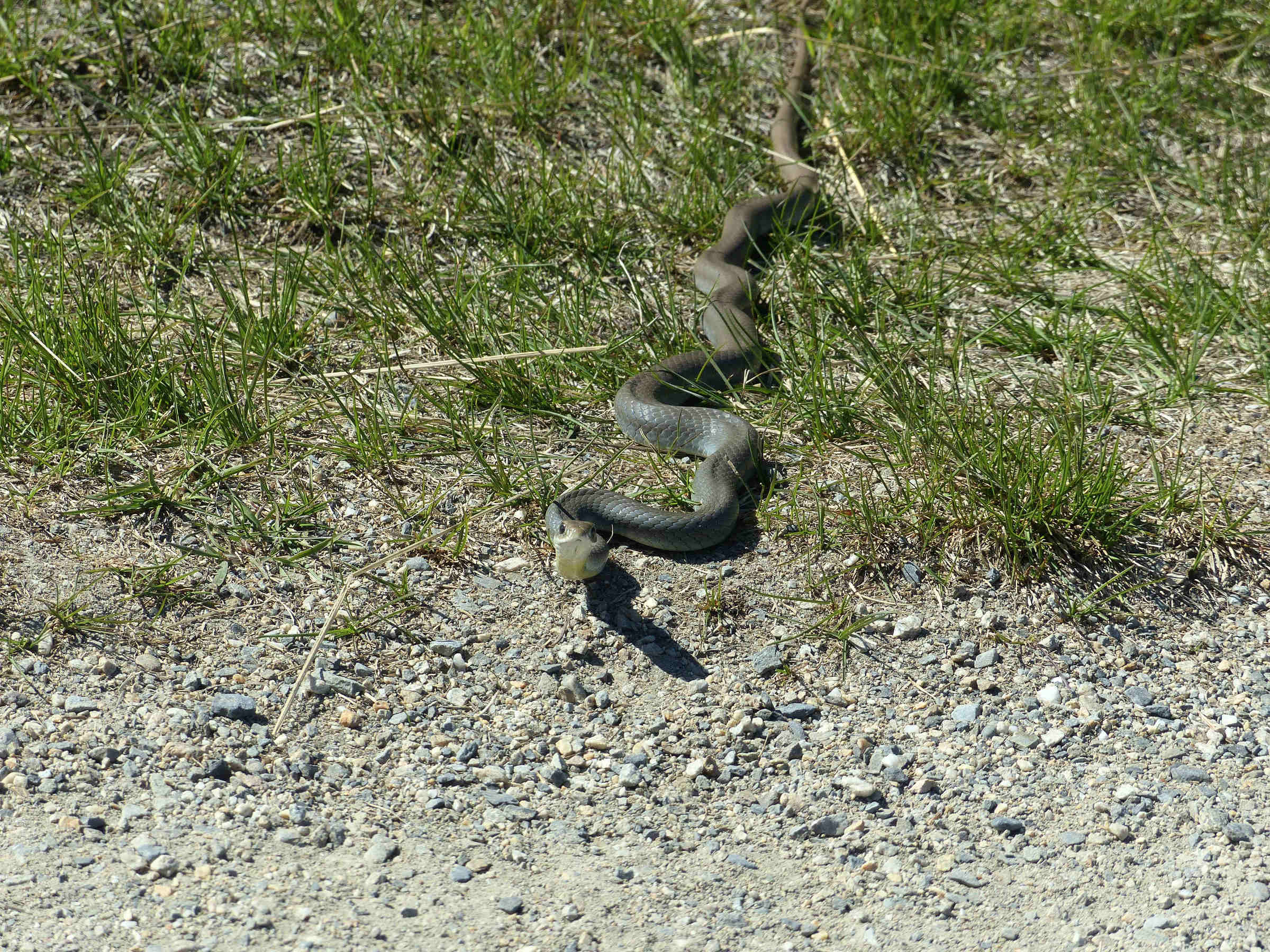 Exactly. Not looking where I was going. If there was a horse on the trail I probably would have schmucked into it, too. Still, it’s a warm day, this is mating season for snakes, and this snake is probably fresh out of its winter den (early). This is a big snake, too, about a metre long, the fierce predator of crickets and grasshoppers, and mice and birds, too. It’s also a curious snake.