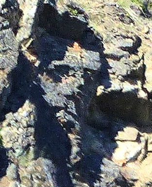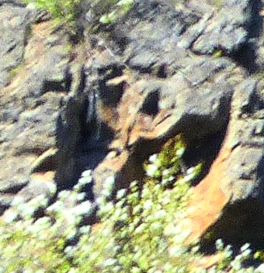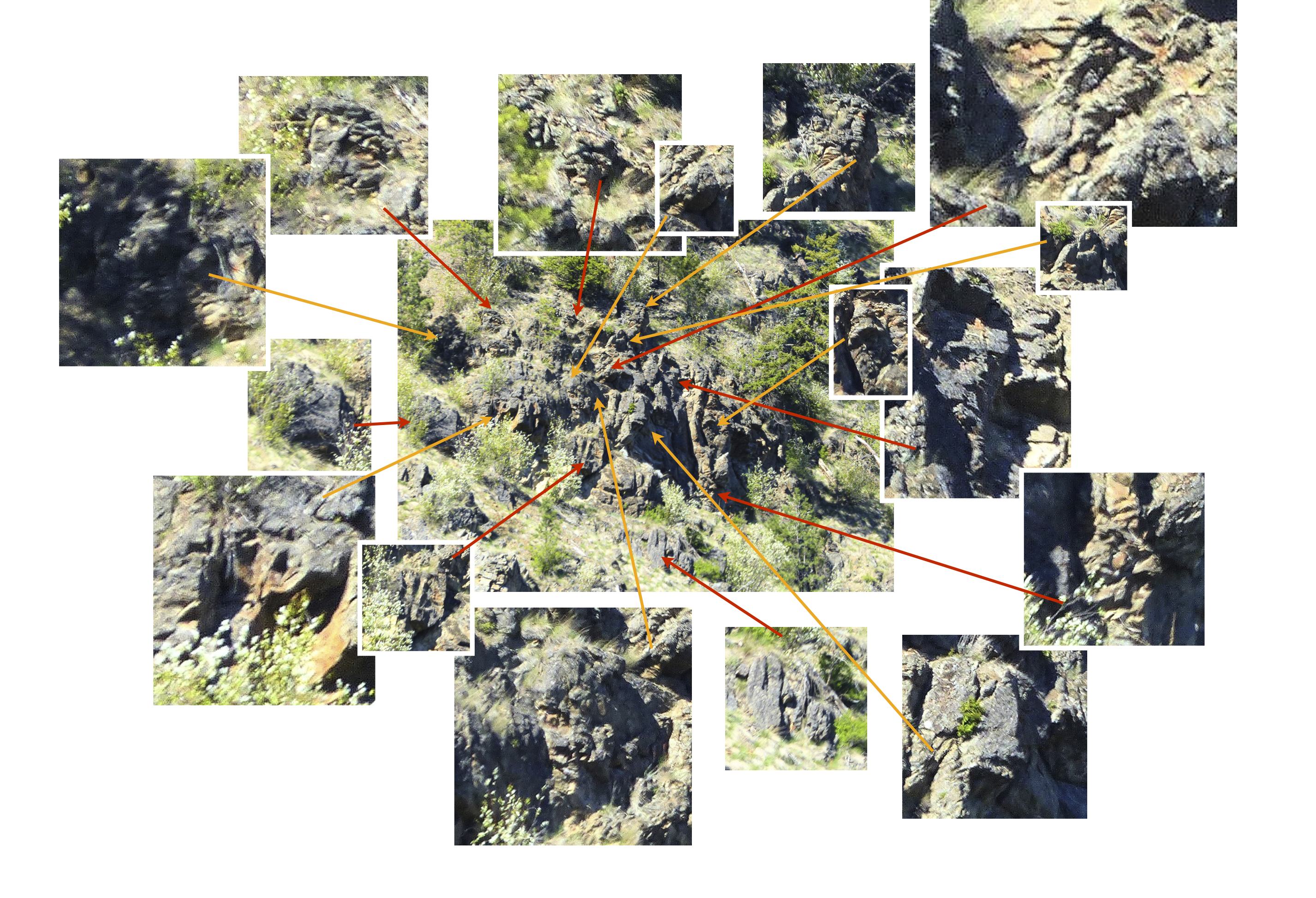 There are miles of cliff like this, along the main trail to the east. I believe there are things to be read in those rocks, spiritual creatures, in the way that you are a spiritual creature, rising from certain forces. In a mind-view that sees the earth and the self as one, there’s no reason that thoughts, traditionally aligned to certain patterns, won’t find those patterns in the rock and thereby affirm the traditional patterns and bind the observer to place. I doubt you’ll see what I see there, which is exactly the point, but, hey, it might be interesting to have a look anyway. To help you out, I’ve blown that image apart into a kind of image map. You can see it, very large, in a .pdf file. To get it just click here: spread.pdf. Thanks. It’s also in the image below… none of it so good if you’re looking at this in a little tiny window on a device from a sci-fi novel. If that’s the case, look down at the bottom of this post. Here’s the image. If you open it in a new window, it should get bigger. Tomorrow, I’m going to show you how narrative might be constructed from these eruptions of the subconscious.