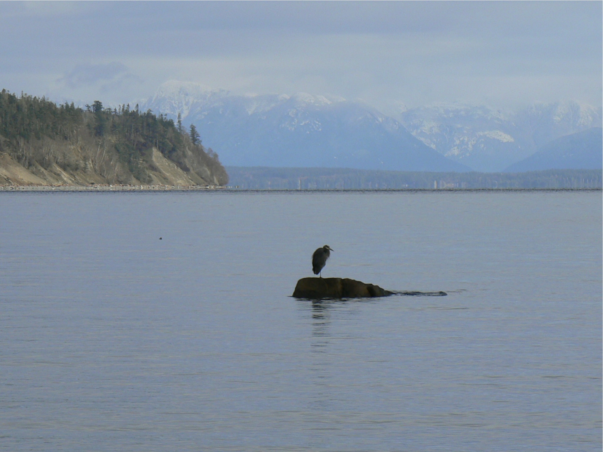 Look at the earthquake lifted into the sky. Plus a couple hunks of mid-oceanic volcanic islands, a lump of an underwater sea monster out of kwakwaka’wakw ancestral time, and a heron hunkering down on top of it as the tide changes.