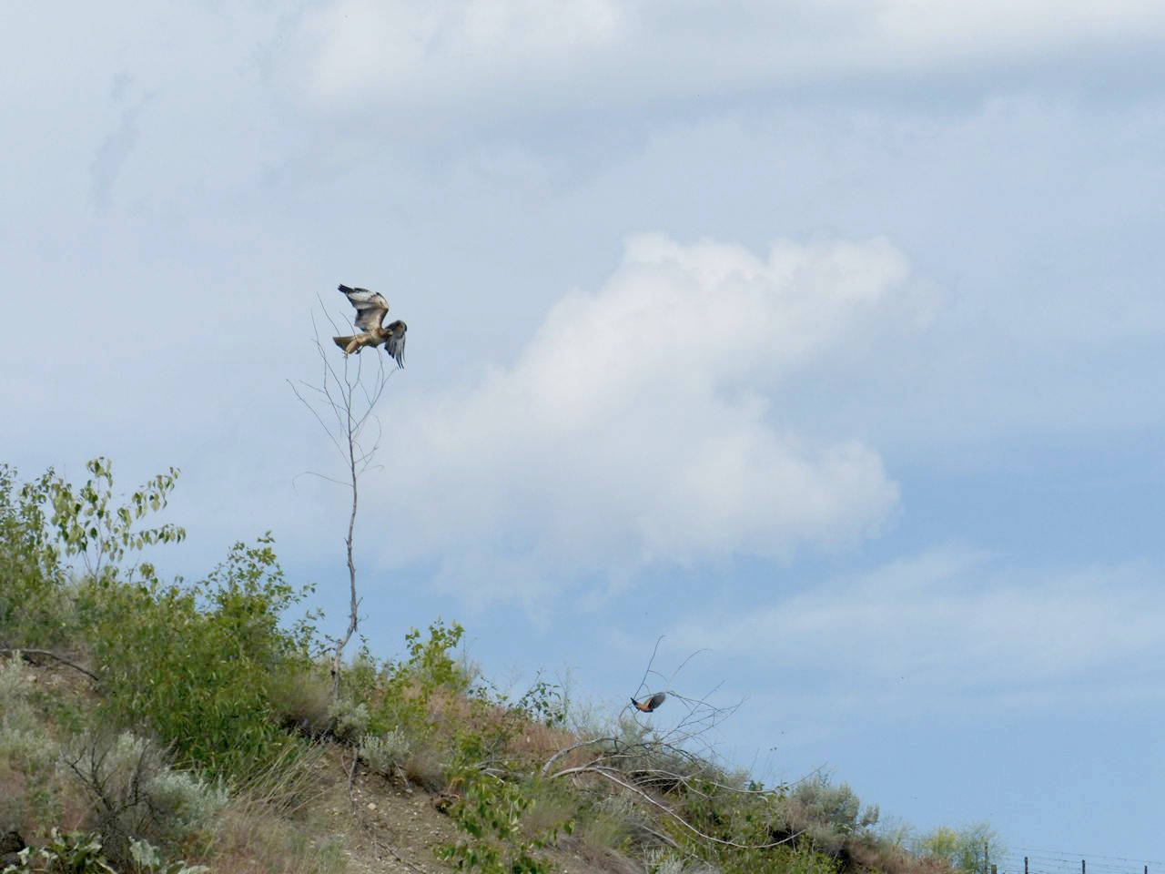 I’ve seen this many times. The local red-tailed hawk rests on this dead sapling. One of the local robins rests nearby.P1820990