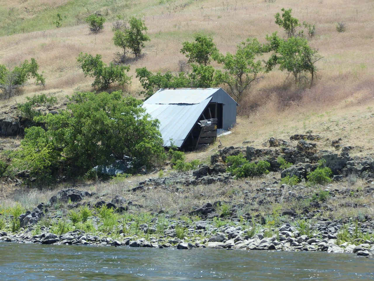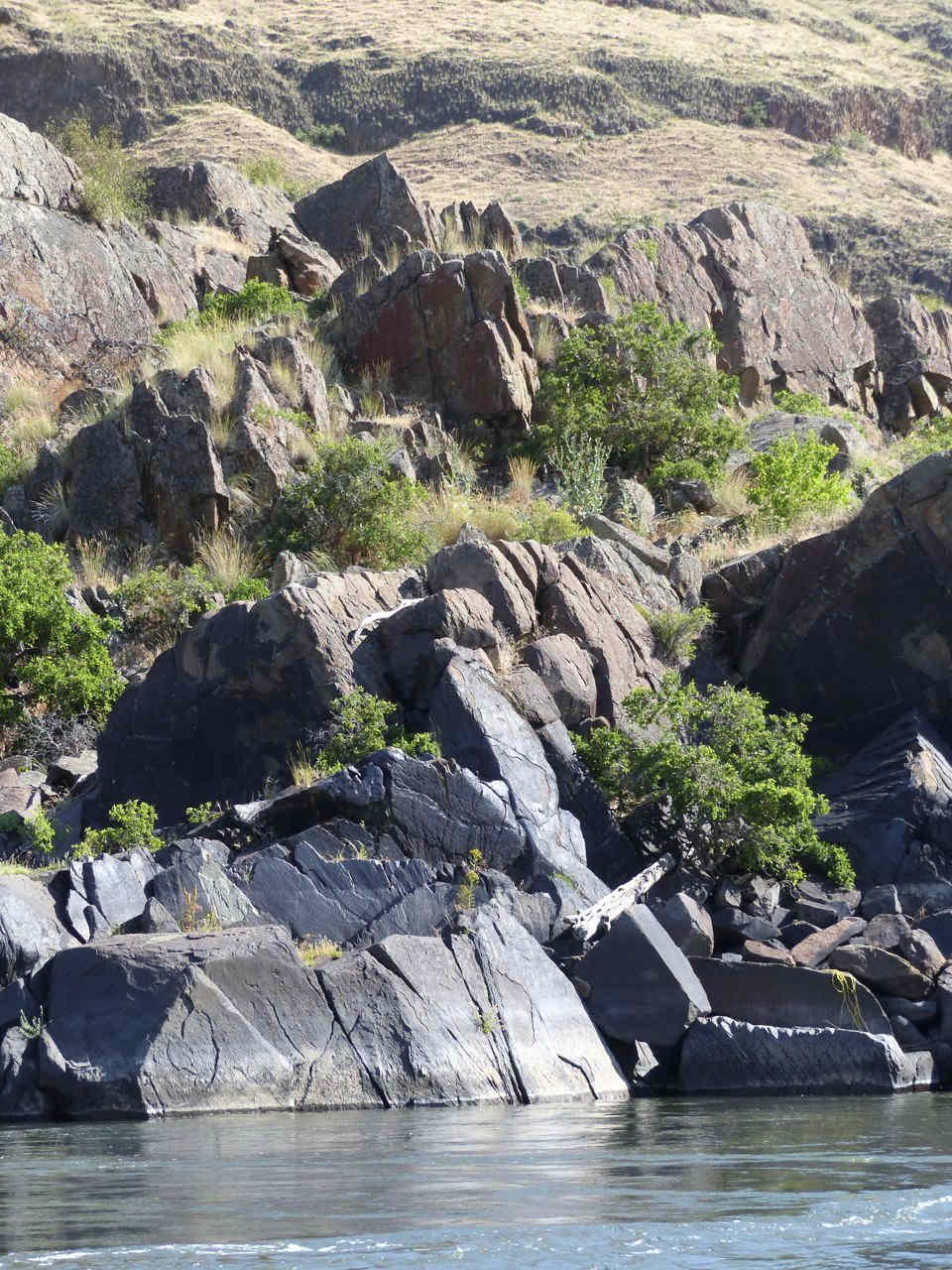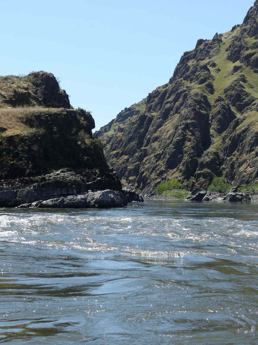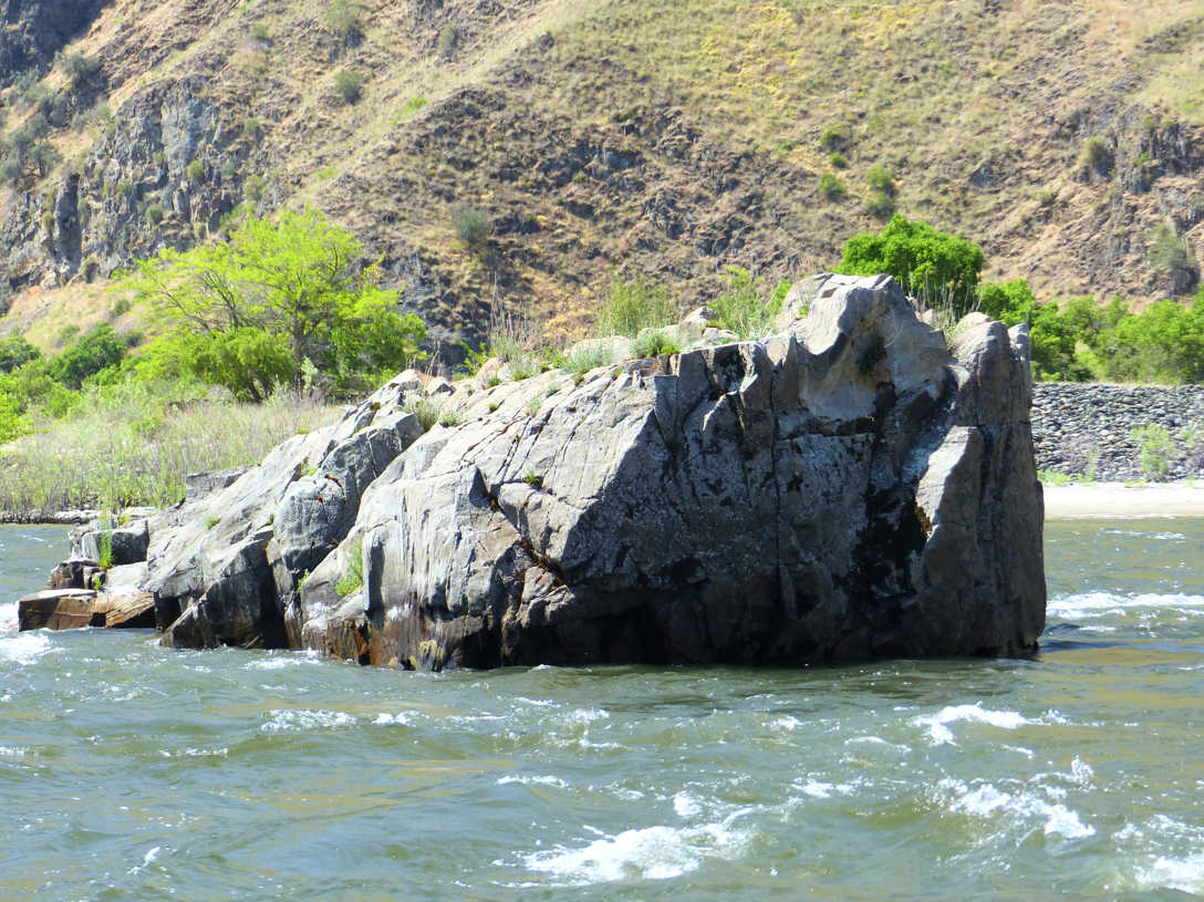 In Joseph’s time, and in the time of his ancestors, the Snake (in the foreground) would have been ten times the strength of the Salmon. Now its flow is controlled by dams upriver. It would have backed up into an amazing fishing eddy, rather than the simple curl of a rapid it ends in now. Here it is looking down the Snake, just south of the confluence. Picture look a bit wobbly? Such is boat life.