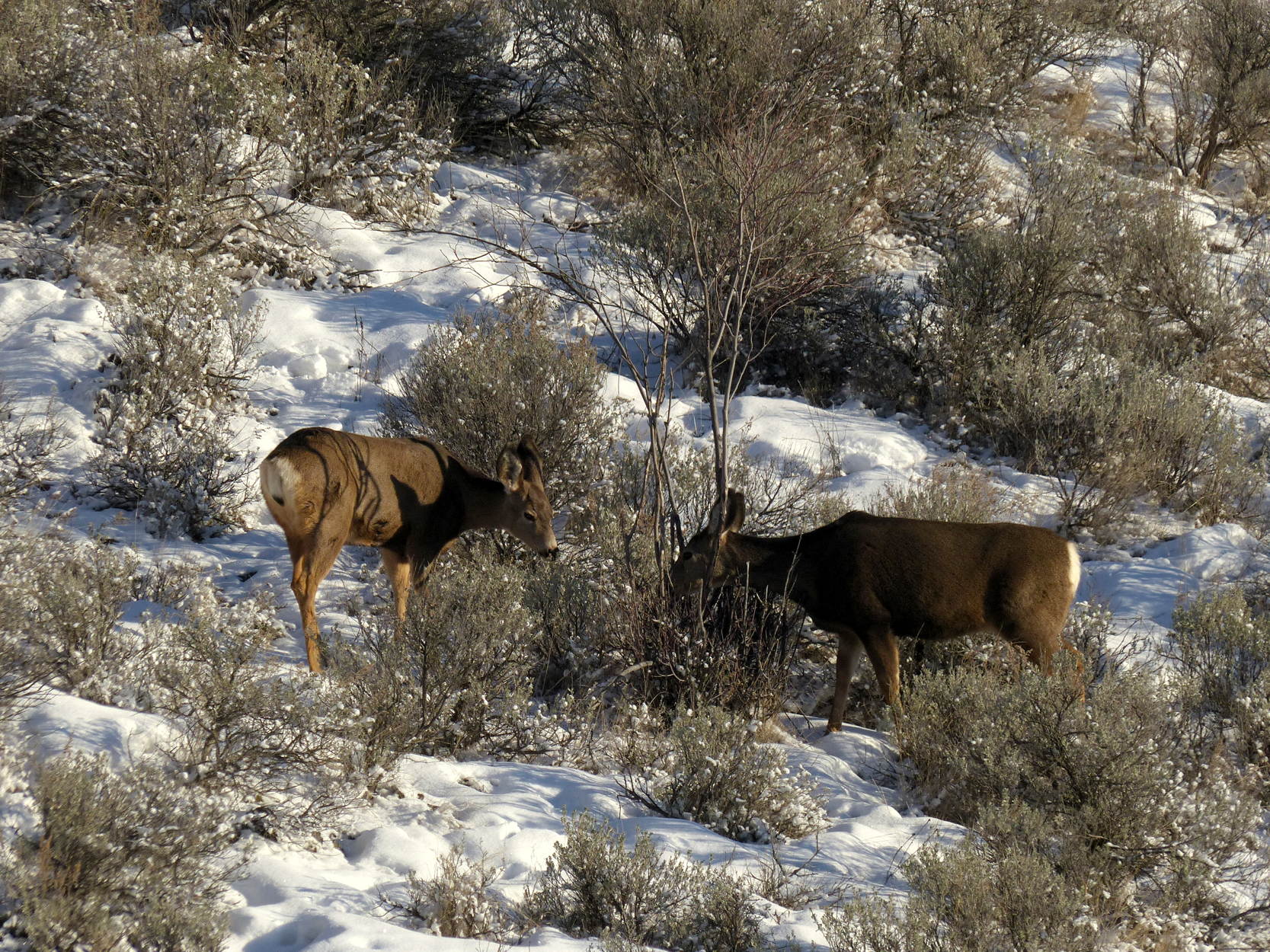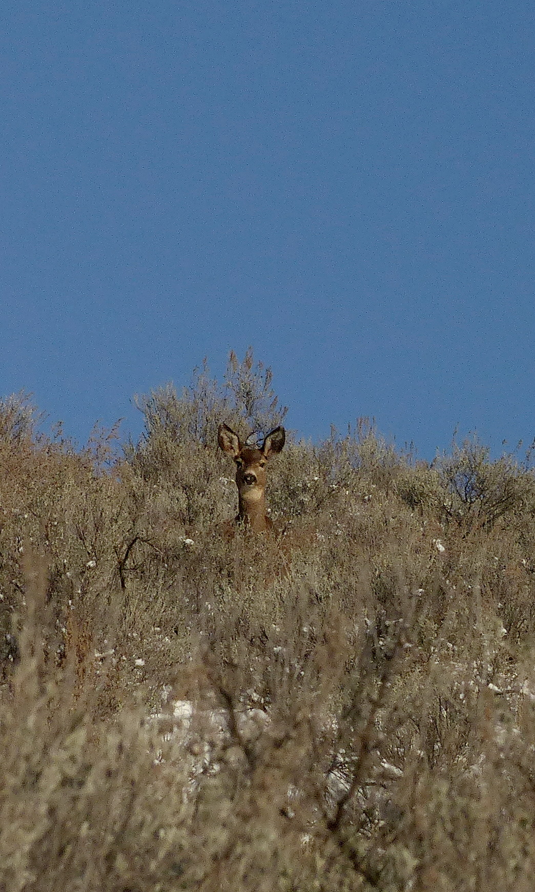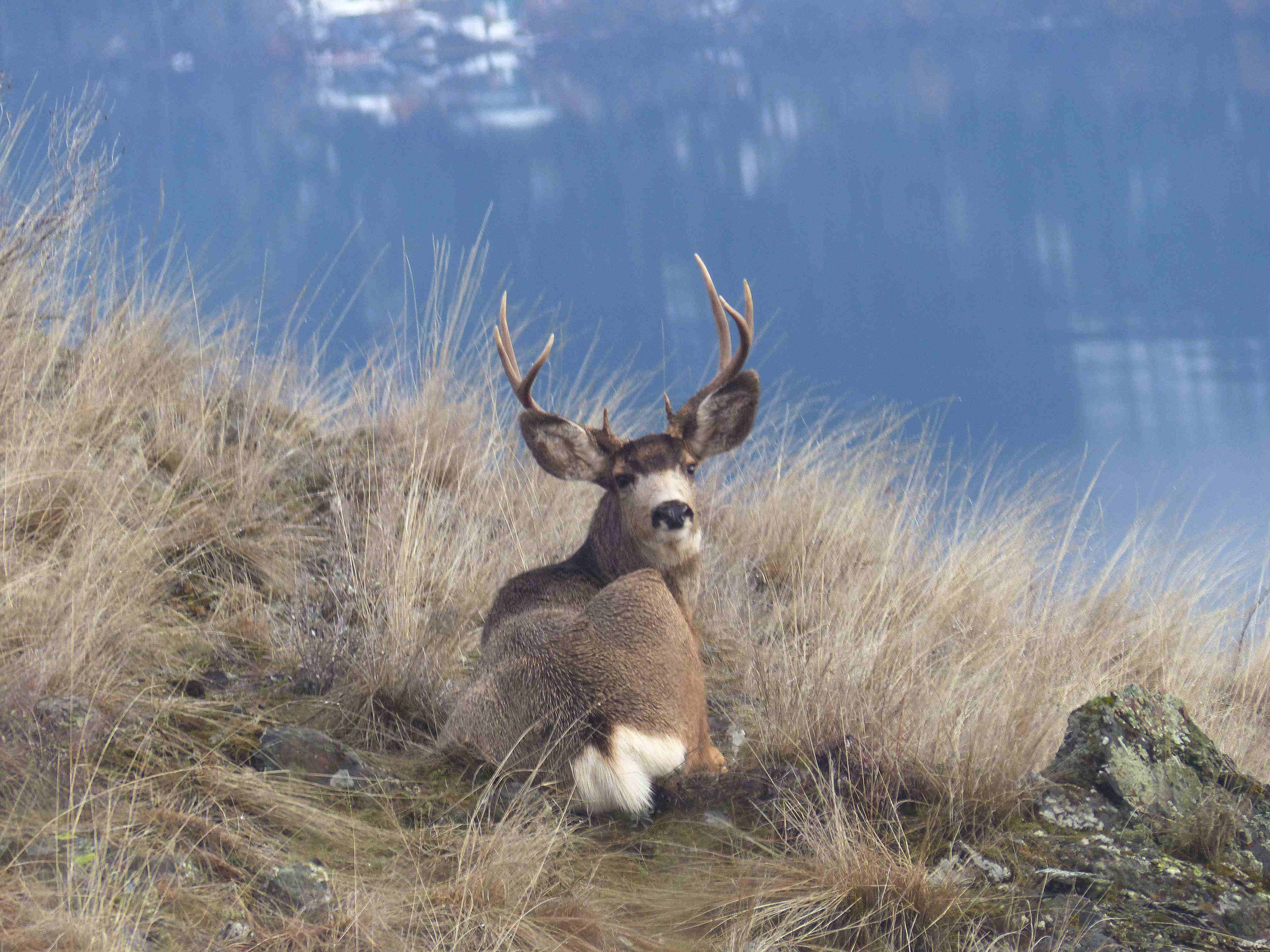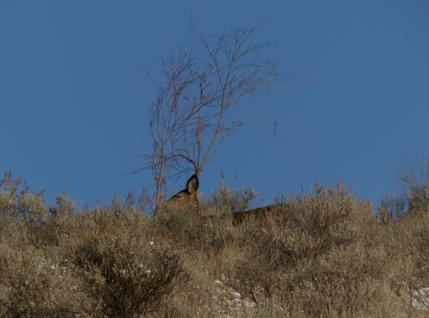 One of the important components of this kind of creativity is that it relates to two lands at the same time: a timeless one, in which all beings are equal and speaking to each other, and one created by them, in which coyotes are wild dogs, deer are four-legged grazing animals, and “the real people” (to distinguish them from the coyotes and deer and so on, who are also people) are humans. These worlds were once one, but are now divided between a world of spirit and the earth, where spirit makes itself manifest as plants, animals, wind, rain, rivers, mountains and so on, which effect human behaviour. Creativity rises from this relationship. A song in Spokane culture, for example, is created by spirits, in their world, and passed to humans, in theirs; when humans sing the song, they gain access to the spiritual world, and spirits gain access to theirs. Nonetheless, the song does not come from human invention; it is received. This is an intricately woven conception of an intricately woven world, in which the grassland hills provide a bounty of food across a wide range of seasons if they are cared for by a principle called Yil. To speak about Yil, let me introduce you to one of the problem deer of Bella Vista.popup By problem deer, we mean that she comes down at night and nibbles shrubberies planted in the front yards of people who keep houses for the summer and, strangely, go away to some place warm for the winter, when the land looks like this: