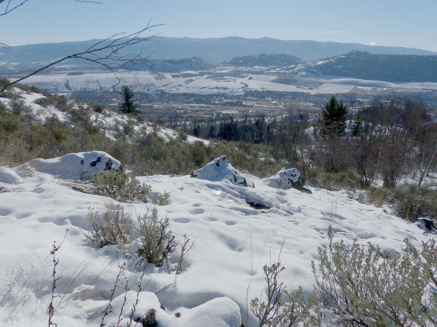 First, some weaving, or Yil. It goes like this: if cattle graze the wetland, the aspens die and deer must eat saskatoons. If deer overgraze the saskatoons, there are few berries for birds, coyotes, bears and humans. With little to graze, because saskatoons grow slowly when deer chew on them, the deer pace back and forth across the hill, eroding the microbial crust of the earth and breaking up the grass and balsam root communities, with a detrimental effect on mouse and marmot populations, coyotes, foxes, badgers and hawks. And why does it matter, if you have cattle, you might ask? It matters because the resilience is gone from the land and what was able to feed all the people, including deer and humans, now feeds only cattle, who are incredibly inefficient at converting grass to protein (and, besides, there isn’t much edible grass up there on the hill for them.) The land ends up producing less, which means it lives less, and since you are in the seventh dimension, and thus part of this life form, you live less, too. After enough time at this game, the land doesn’t even support cattle anymore. Just sagebrush, which is only good for burning up. The image below shows a grassland converted into a field, across the valley, and a wetland clogged with houses and roads in the valley bottom, where the deer should be hanging out and which should be feeding thirty kilometres of 135-kilometre-long Okanagan Lake, but is not any more.