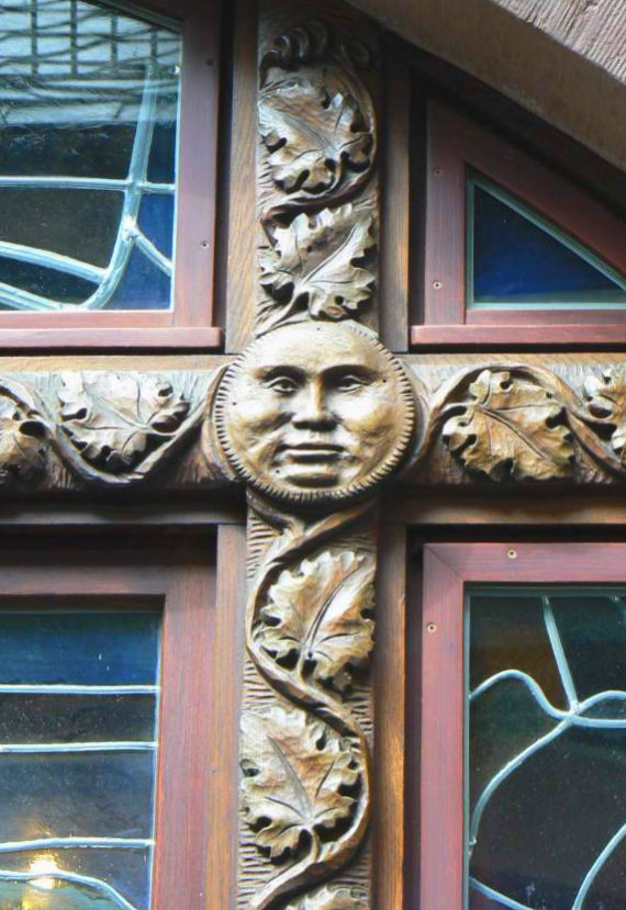 They didn’t die out in Christian tradition either. Here’s a kind of accommodation in Rüdesheim itself. Christ as a sun, at the intersection of heaven and earth, and, look, he’s really a wine cork, and the cross is really a grape plant, here where wine-making began as an act of  Christian devotion and commerce. Christ as a sun god? That’s not really Christ, is it, and those vines? Pure celtic.