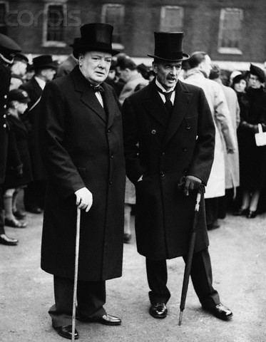 British Prime Minister Neville Chamberlain (r), with Sir Winston Churchill (l), ca. 1939. — Image by © Hulton-Deutsch Collection/CORBIS