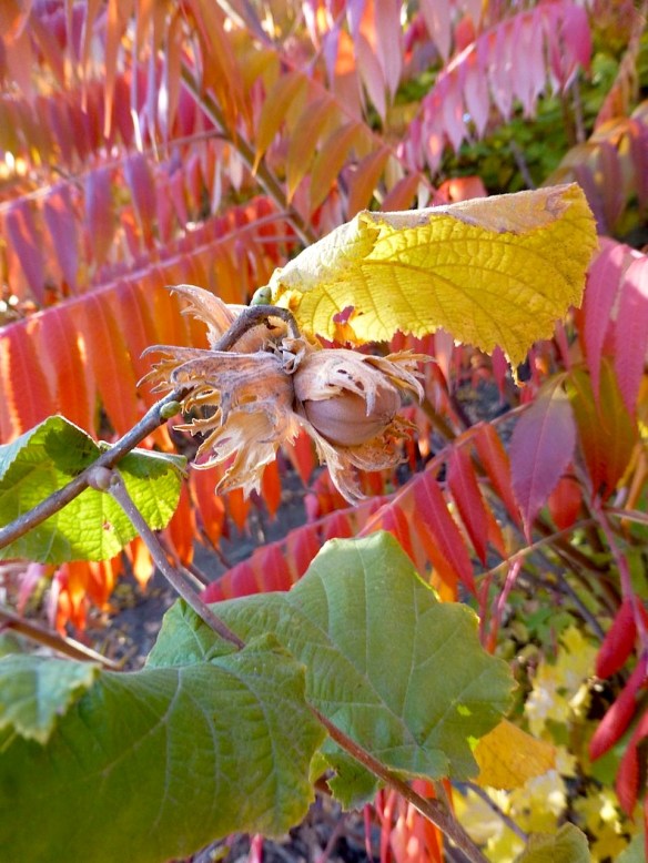 There’s a wild bush down my road, and the one I planted five years ago, as a four-foot-tall sapling, is now fifteen feet tall and rich with nuts. Here’s the wild one, hanging out with a sumac.