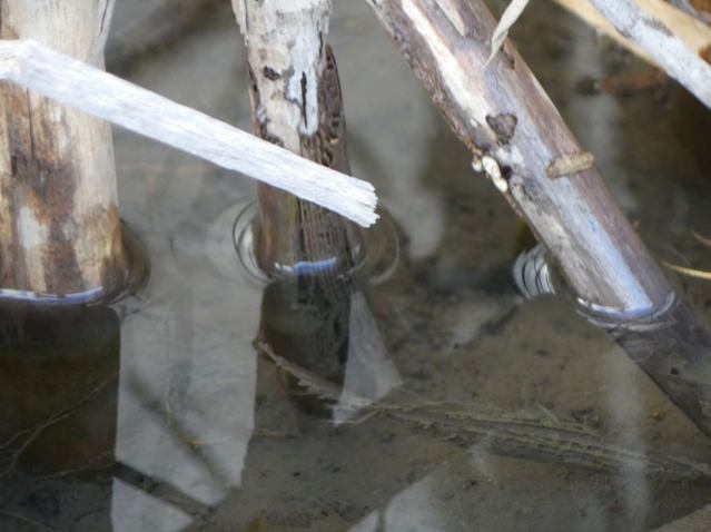 When a breeze shifts the old cat tail stalks, the energy skin on the water kinks, again and again. Water remembers each kink.