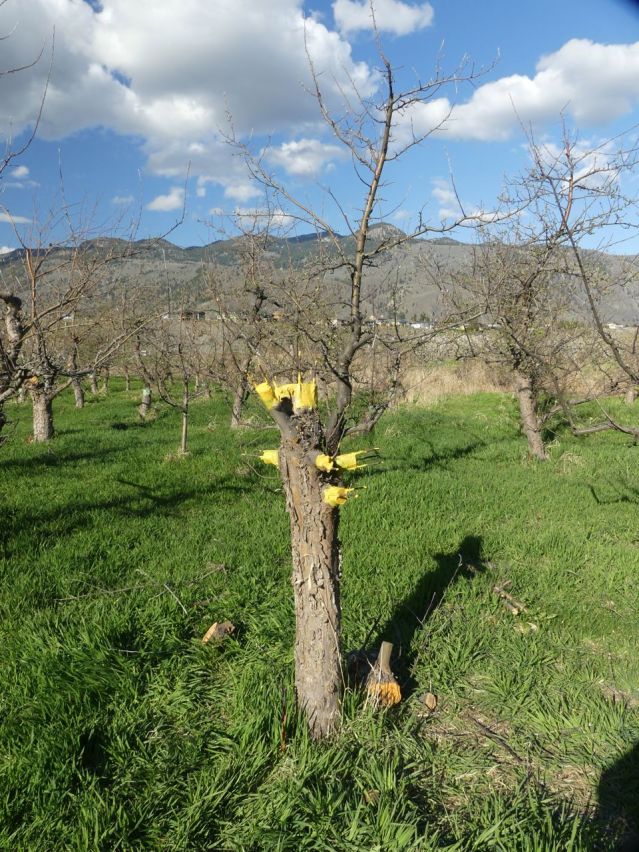 I cut the scion wood in March, wrapped it in cloth, and buried it in my onion garden. Today, eight hours making the world new, then two hours back home.