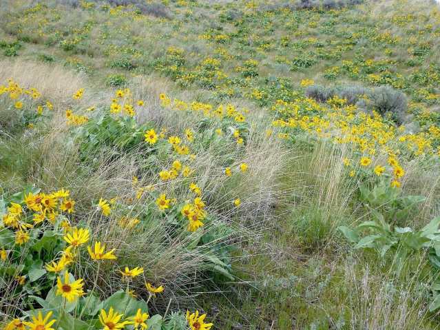 This is a ruin from a war over the land fought unevenly over the last 160 years between the valley’s syilx people and various industrial farmers. By 1871, the land was trashed by overgrazing born of ignorance. What you see here, a chokehold of big sage interspersed with invasive cheatgrass, both of them useless in these numbers for supporting complex nets of life, are replacements for a rich grassland that flowed with life through the year. The rich grassland was a creation of a partnership between the earth and the syilx. Its trashing was an act of aggression: ignorant, for the most part, but aggression nonetheless. Still, a small amount of life survives in the ruins: voles, and the coyotes, bears and hawks who hunt them, all dependent on the lighter-coloured plants you see above, the arrow-leafed balsam root, a kind of wild sunflower that has adapted to the ruins and is recolonizing them. That is a vision of hope: a ruin, sure, but hope nonetheless. Note how much water these flowers represent, and how much of it flows through a renewable web.