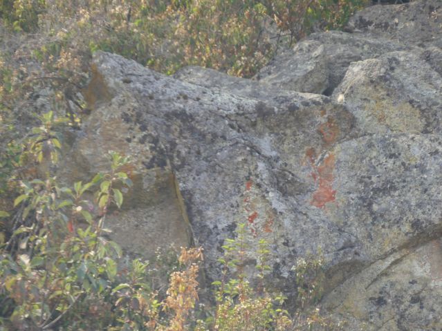 Typically, these stains come from lichens that inhabit places soaked with bird or animal urine: points of presence or habitation, often with a darned good view. In other words, they mark the markings that non-human people have put on the land, while placing themselves in a point of sight or visibility. These non-human people are called animals today. In an Indigenous world-view, humans are no different than those other people, and make the same marks, with one difference: the humans are conscious of following the pattern. Here is an elk and an eagle from the Tsilqhot’in Illahie.