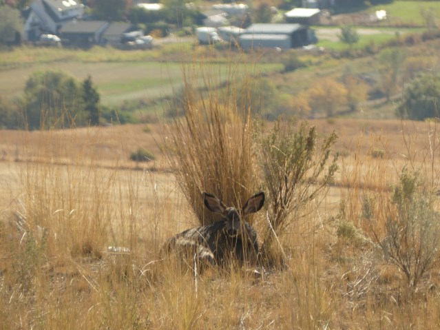 Ah, you spotted the doe. She never left. Here she is. That’s her trail leading downhill to the corner of the vineyard fence…