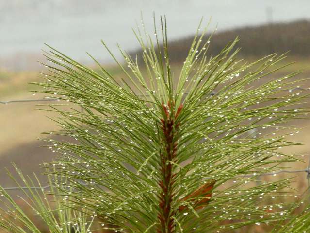 Not only that, but look at this young one drawing the rain in, shedding it off her waxy needles, and then holding it on their rough undersurfaces. Right now, she is breathing through a cooling veil of water. It’s a kind of hibernation.