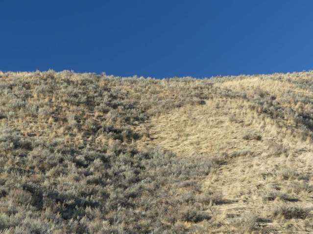 The shade on the south western slope is keeping it damp in the soil, and the bunchgrass on the hot north eastern slope is holding it in its roots. Same thing one cut to the west, below.