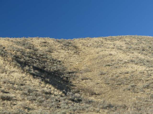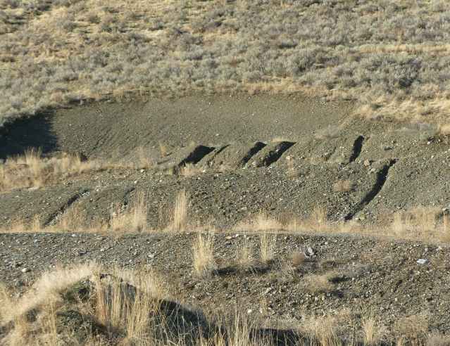 The shade on the south western slope is keeping it damp in the soil, and the bunchgrass on the hot north eastern slope is holding it in its roots. Same thing one cut to the west, below.