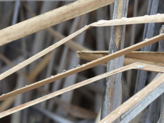 … to create an insulating skin stronger than the pull of the sun to draw the water into the air, kind of a miniature atmosphere, really, like the water spheres on the cattails below …