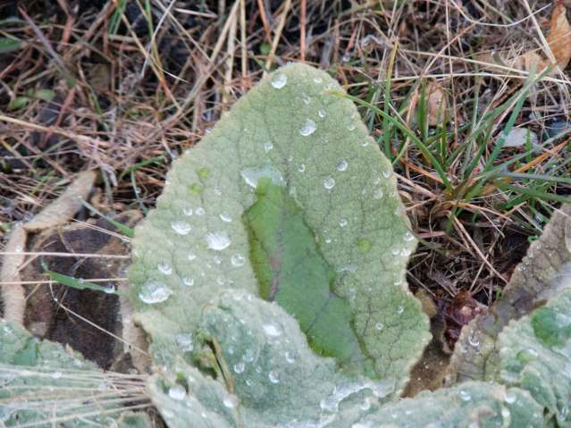 In mullein’s case, it covers its pulpy, absorbent leaves with tiny hairs, which capture the tension of water, like this…
