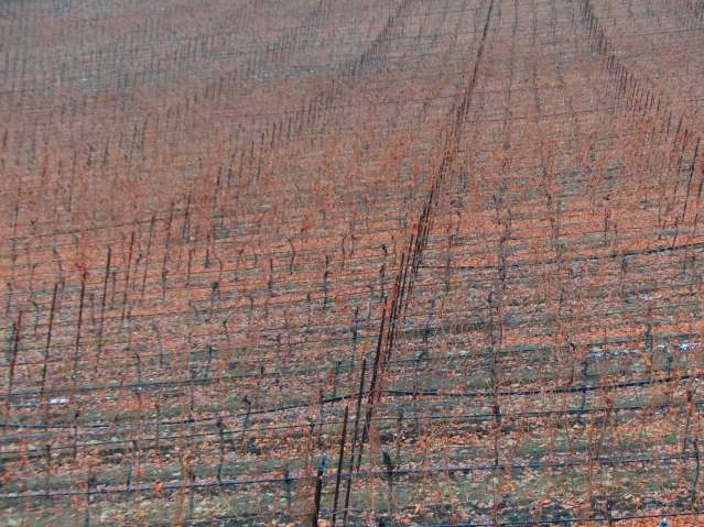 In this vineyard, much of this work is already being done, but in a model conducive to machine harvesting and the capitalization of water (huge volumes are required to pay for the huge cash outlays required to support the system.) Β It might be, however, that the heating and cooling effects are as simple as turning stones over, so that their white bellies, of solidified soil salts brought to the surface by the sun, send that sun away, to allow the stones to operate as the engines of cold we need them to be at this time.