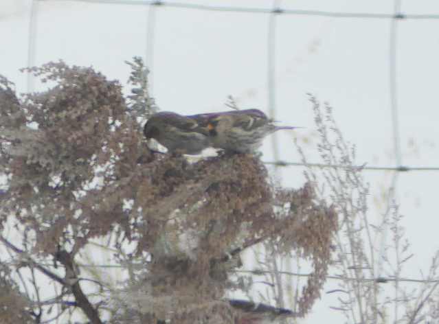I pored through the bird books, and that purple splash on the head and the yellow beak suggested sparrows. Any red poll pics I found had no yellow beak. But redpolls, in my memory, are a bit smaller. I’m no birder, though. I hedged my bets by not saying which ones. You think redpoll is more likely? >