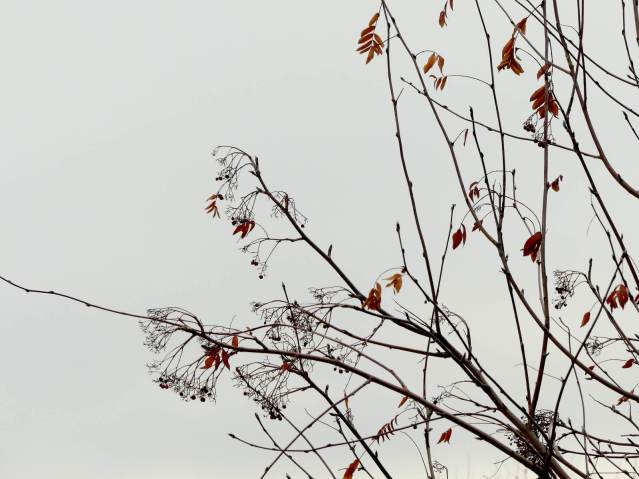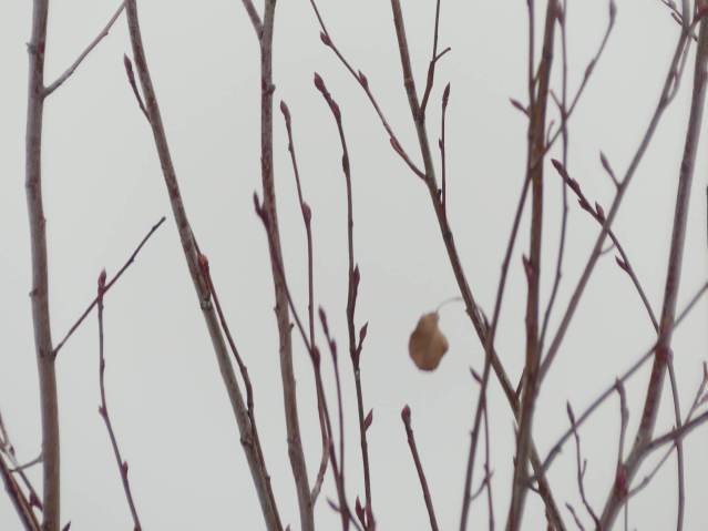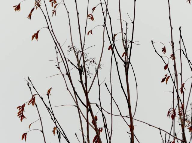 The process balances the climates of soil and air (separated by a layer of snow), which the trees bridge. Roots grow in cooler climates, which means that to them the soil is effectively warm right now (relatively speaking), although not warm enough for rapid growth. Because their growth at this time is slow, they need time. That’s what the buds are signalling now: not today’s need, but a future one. And so, very slowly, the tree begins. It is the same for the mountain ash, below, which also began this process today. Look at those fat buds at the end of the twigs. They are only slightly behind.