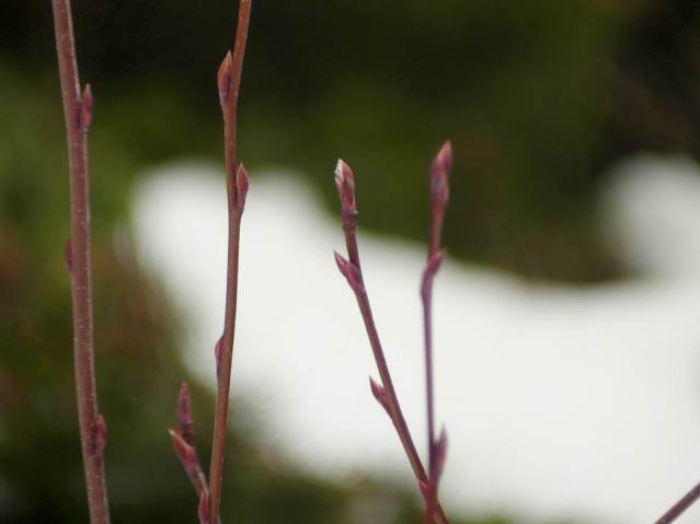 The buds of saskatoons opened on February 1 this year. We can expect the cold to keep them in this expectant state for many weeks yet. Look at the tiny blossoms touching the air without their shell below.