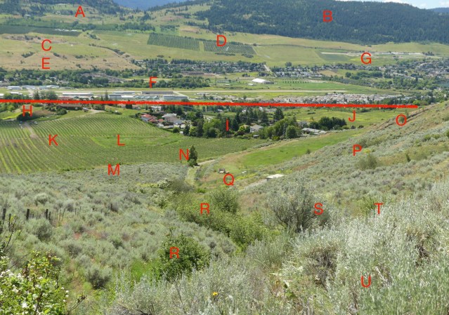 A. This slope is off limits due to unexploded ordinance from WWII training. No cleanup is underway. Much of it is indigenous land. The Vernon Land Fill lies on sacred Syilx ground behind this slope. The pass to the right of the “A” is the old trail to the far north. Older than the Pharaohs.