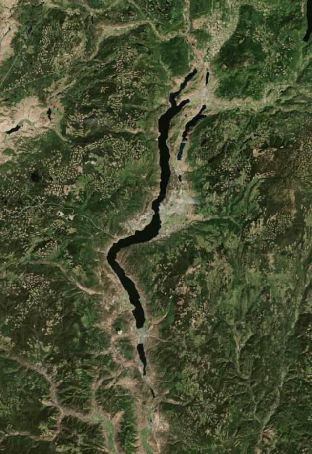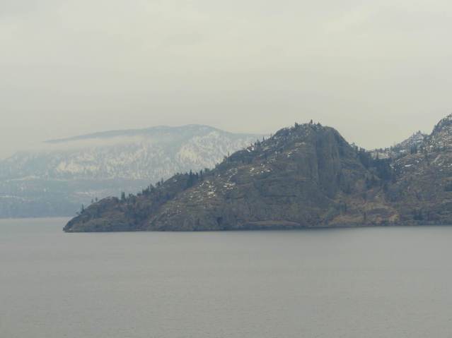 Well, here it is, Okanagan Lake, a fjord lake over-deepened by a melting glacier and filling a gap some 1600 metres deep. The rock in the background of the image below is Okanagan Mountain, the prototype for the mythical serpent that lives in the lake — that is the lake and the mountain and manifests in the wind and current off the mountain’s snout.