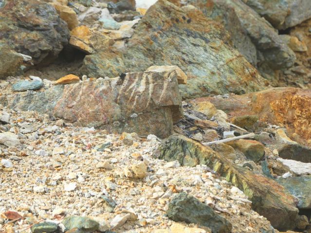 Here’s another, in a dry wash. Note that the annual spring flood has deposited random stones on top of this striated rock. The divided energies of the rock, held within its unified form, hold a pattern of their same substance that is laid down in the way of writing or any other mark making, and read like it, but to no cognitive end.