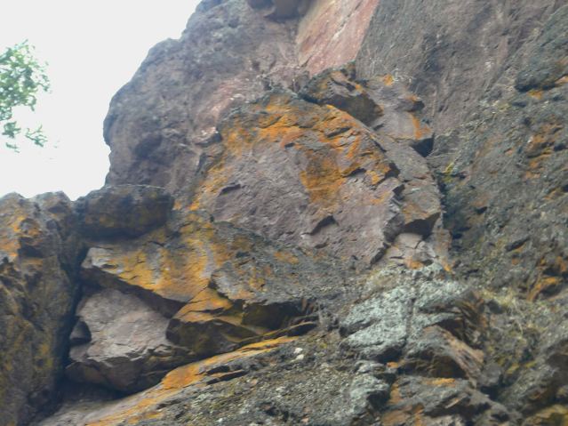 As you turn back, look at how old its upper reaches are and how newly-exposed its base. It fell off a cliff, not that long ago. Note the figure sticking out its tongue on the right, near its base, and the complex figures combine fish and moon higher up. The lichens on this rock likely spread a mm or so a year, but we are looking at many generations of them.