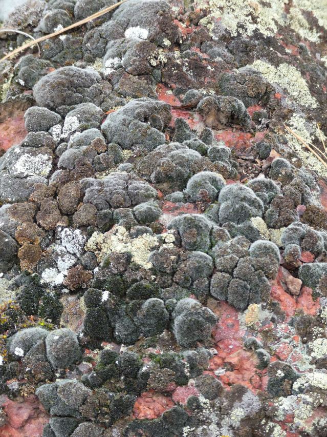 Still, thirty metres away along the trail there is a rock that has picked up soil lichens, long long ago. Note how they break off and form new colonies, just like the rock did above.