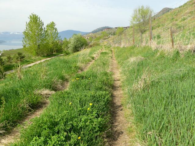There’s lots of room for making this work. Here is the Grey Canal Trail in Vernon. Note the bounteous room for saskatoons, that is currently growing weeds, which are mown to look pretty. Sure.