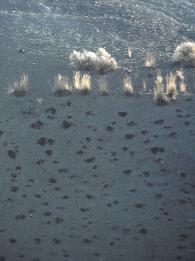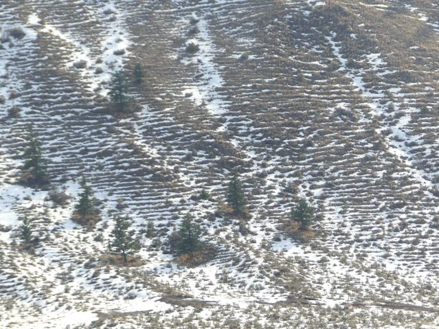 These musical chains of vertical patterns dominate over lateral ones caused by both slumping and the deer that create precisely-angled trails across it.