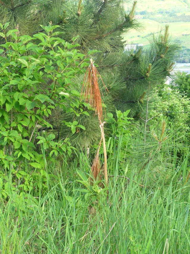 … killed last fall by a buck rubbing the velvet off his antlers, and looking dead and out of place. The thing is, it operates as a flag and a stand in for the deer, and adds the presence of the deer to the landscape. Removing this tree to “beautify” the park would diminish the human experience of it and enslave humans to an artificial notion of beauty very much a product of books. It is not just humans who can be enslaved, though. The fir tree below might have a thing or two to say about the ethics of the notion that a human can “own” a tree, and has the right to do with it whatever they fancy, however stupid. In this case, one family planted it as a hedge and a new owner got the idea that we wanted to see out instead. The result is perennial violence.