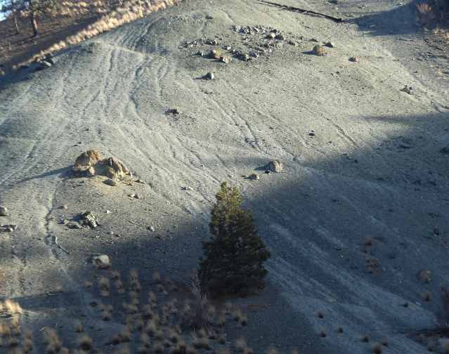 Ponderosa comes from globular cones, which roll down hill. When they lose force, they stop, likely because the sharp hooks on their lips have caught on grass and sagebrush or because they pile up on each other like wind or water.