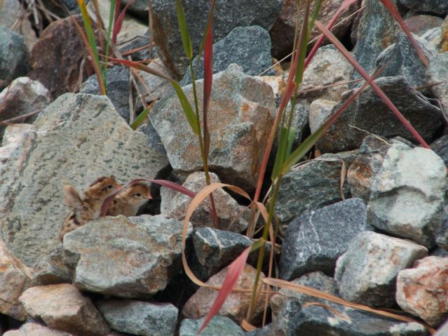 A clutch of a dozen quail eggs hatched this morning, and I surprised the chicks and their parents at the bottom of some rocks put in to eliminate life from a small part of the planet and called landscaping. Ten got away under a set of stairs. Two were left behind, and had to give it their all.