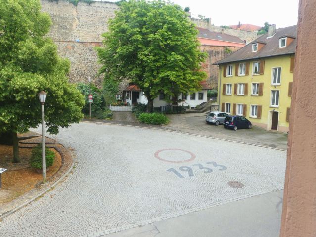 But, let’s not forget that in the City Museum, 3500 years of history are portrayed, with the exception of 13 years, between 1933 and 1945. In their place, there’s a window, eh, and you can look out on the street, and not just any street but the Langer Weg, the long road. As part of a government project to boost a broken economy and put men to work, it was cobbled in, as you can see, 1933, as a symbol of the Nazi’s favourite metaphor, the long road they had taken to power. In 1945, the swastika in the red circle was removed and so the circle became a null — a zero.