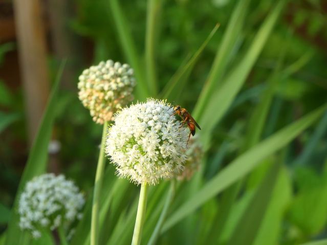 … and then in my garden, where the hill has come down to visit, drawn by the flash of dawn as well (even in the early evening.) First, shallots in flower…