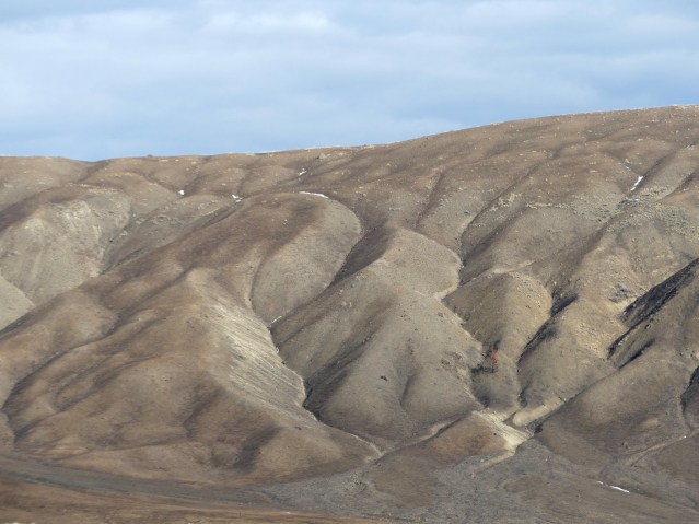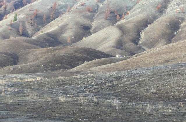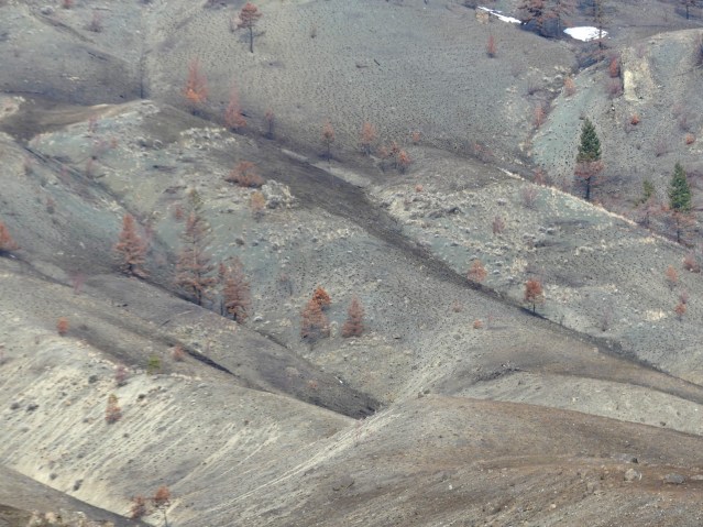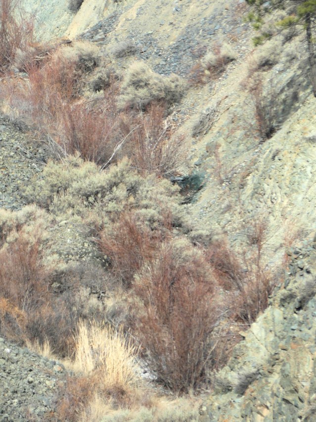 The beaver lodge is at the side of a pond (because the beaver needs access to both land [for food] and water [for food storage and protection]; the ant hill is at the side of a rock (because the ants need access to both sun [for heat] and earth [for protection.] In both cases, these animals have recreated the world in the midst of winter, both with an artificial sun and both with an artificial self within water (beaver) or earth (ant). Are houses no different? If so, they’re not really “choices” or “creative solutions” so much as reflections of the planet as it mirrors itself. What’s more, both have an inside and an outside, and both have the capabilities to shed (rain, predators, snow for the beavers and excess stone plus predators for the ants), to be either within or without, and to gather in (food and members of the social group). It could be even simpler than that. In Secwepemc society, and all Plateau cultures, all the children of Sen’klip (loosely translated as Coyote) by different mothers, all creatures are in a sense people, ie part of a social group. That’s not to say they are human, but it is not to start from a point of difference either. If this principle is solid, then what these houses gather in is social life. Now, if this is so, it’s going to have to work out on the earth, too, otherwise it’s no principle at all. So, let’s look at some fine Secwepemc land above the Thompson River. If we are outside of this land, if we are not viewing it as a social space, we will see erosion here, cutting the hills away, something detrimental to stability and endurance. That’s a very Canadian point of view, and very scientific, but is it accurate?