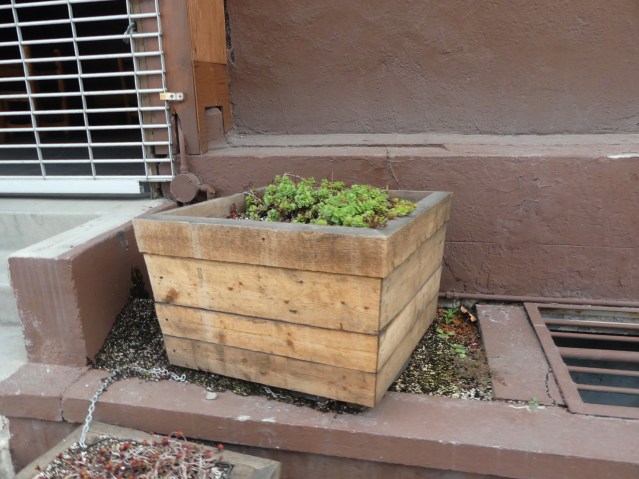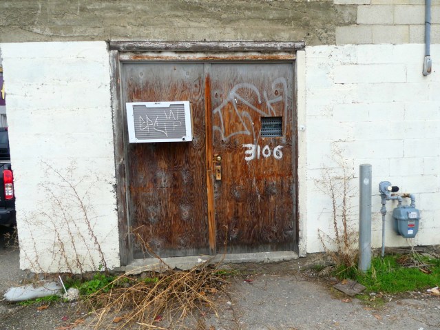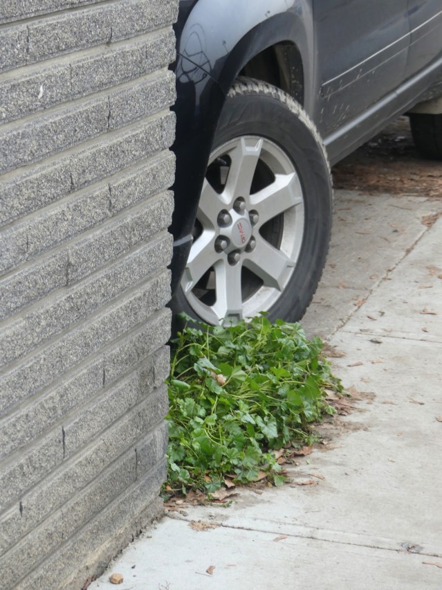 … is now a cement wall (yet lovingly maintains a few loading palettes out of, what? nostalgia?) And the downtown residential alley parking space below, with its house plants tipped out just in the middle of the alley, making good soil…
