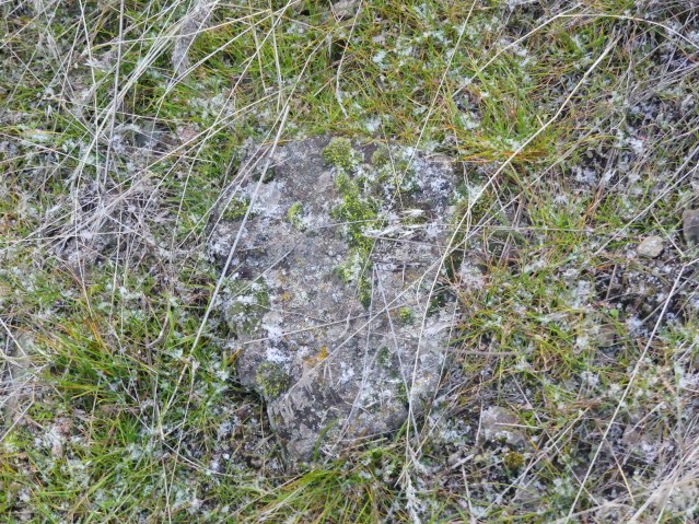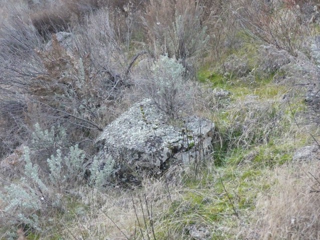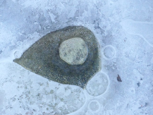 …where the first snow does not collect because the sage is warm (relatively, eh) in the sun, here’s a stone (below), a stone that has found a different equilibrium with the sun and the cold of space because of its separation from the body of the earth and its differing mass and dimension from the thin, hairy leaves of the sagebrush. Look at it holding the snow that has precipitated out of the air, just like the salt above, and just as it holds the salt above, but in reverse. That’s some powerful stuff!