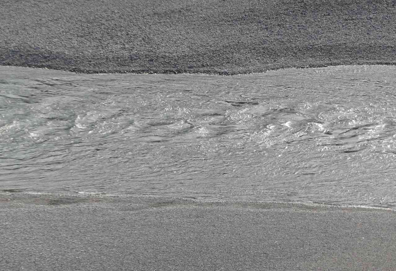 Below, I offer a closer look. See how the current blurs out in the background, moving at speed, but the slow current, caught by the ice, is visible, far more so than in the river above? It is, as the camera teaches us, focussed, but focussed in a language of flow rather than just light, as the camera tells us. Don’t be fooled by the camera, that’s all it knows, the poor thing.