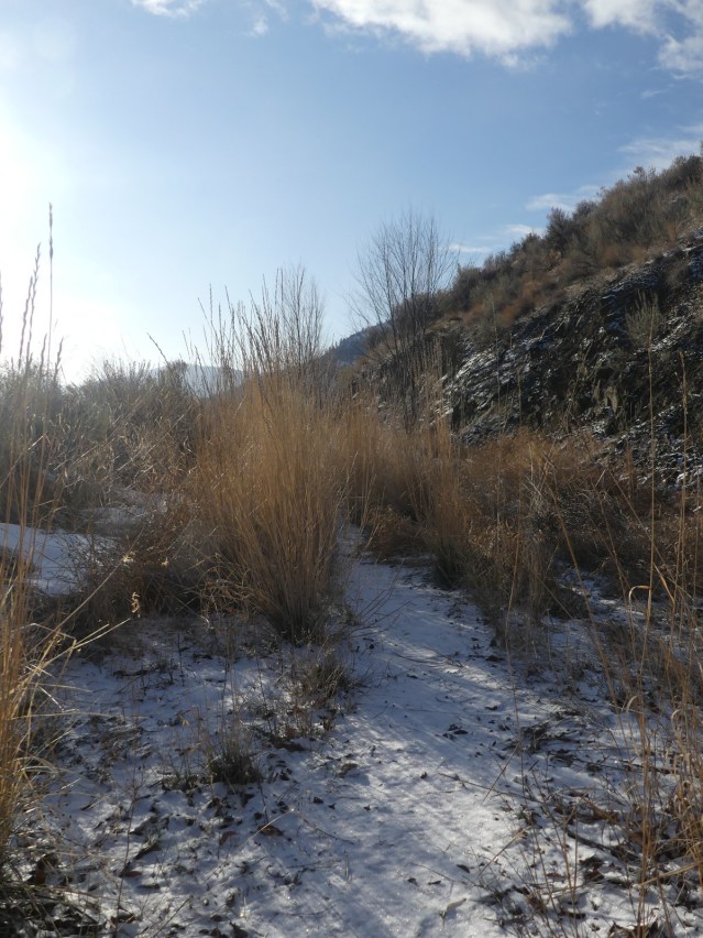 That’s an image of an invasive weed, knapweed, in ice released as water from an excavation that destroyed an 8,000-year-old rattlesnake nest to punch a road into a real estate development. We witness it here catching some hoarfrost.