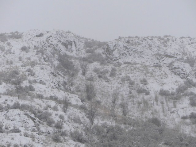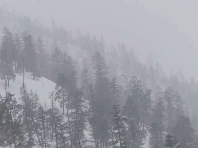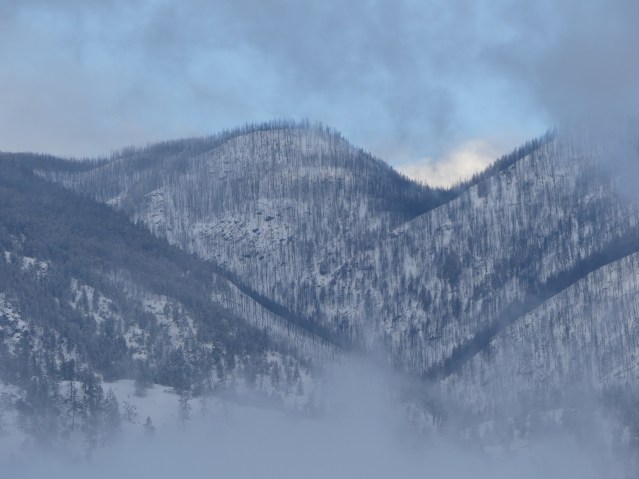 Otherwise, it’s called Puddinhead Mountain, but these names are silly. K-Mountain, Puddinhead (not to mention Sugarloaf)… what a funny bunch of things to call the sky. As you can see from the ridge to the west of K-Mountain, you can also read last summer’s fires set amidst last night’s snow and the new snow of the afternoon. The clouds and the mountains are not separate.