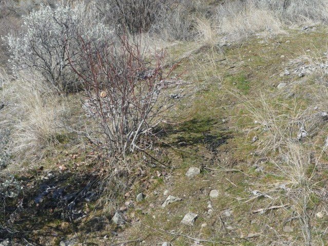 The pellets are spilling down hill from the shadow to the right of the siya? bush.