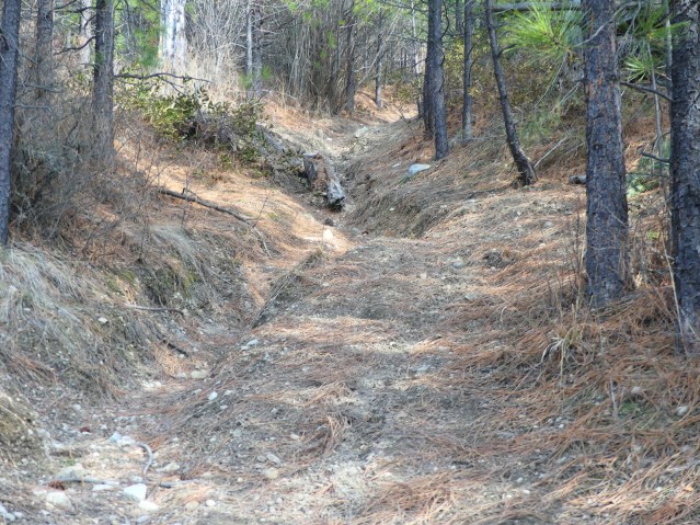 Here’s a human. trail, a recreational trail to aid hikers to climb to Kopje, a basalt outcropping above Okanagan Lake north of Kelowna. You can see a fine crop of fire pines ready to go up like gasoline here, and heavy erosion, where water has followed bicycle and motorcycle tracks down the hill and over deepened them.