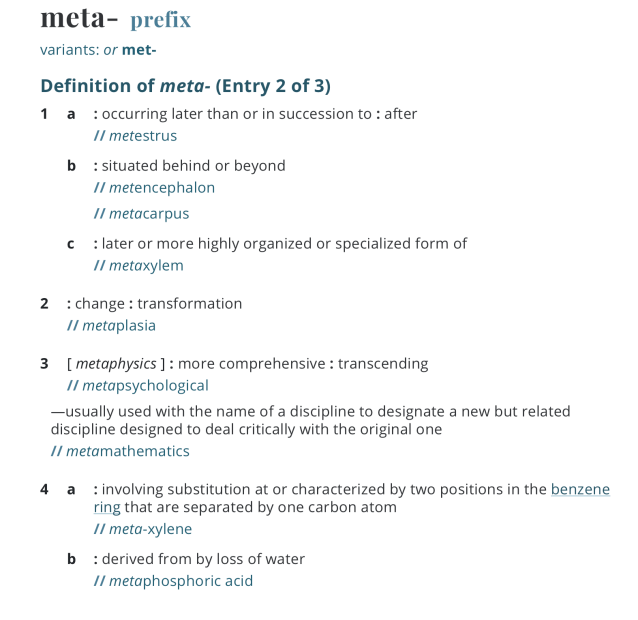Putting the two together, we get a sense in which “meta” is wit-full rhetoric that transcends its formative principles. This is the principle of science, a ladder of thought built on chains of “known” attributes of the world, combined in logical sequence. It is very powerful, and can lead through a secondary application of meta-thinking to powerful applied technology.