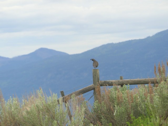 And this quail, with one leg, on his pressure-treated (copper-poisoned) fencepost.