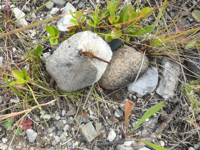 The damselfly survives the cold of September, extending summer, by perching on a rock that absorbs the flame.