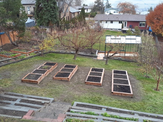 We’re getting there, eh! Garden boxes built, garden terrace built, greenhouse ramp and floor built, sand on the muck between the garden boxes until the grass grows back, hazelnuts picked, leaves raked up, spinach, cilantro, mustard, parsley, apples picked, arugula and corn salad still growing strong. Chamomile has regrown, waiting for spring. Some self-seeded peas to the right of the greenhouse are still hanging in there. All this four hours before the rains really set in. Garlic snuggled in under 14 inches of leaf mulch. Next, mow the grass as mouse control, plant the onions I moved out of the raised beds before I demolished them, some serious weed removal that came when I imported some plants from my father’s garden, another unit of raised beds behind the apricot tree (left of the greenhouse), replace the composter, build platforms for the rain collection barrels, and benches for the greenhouse. I even had a raccoon visit, digging up something from the compost under the terrace to the left. Mysterious! There are still 2 Honeycrisp apples on one of the trees. Can you spot them? Next year, this will be a main gardening time, to take advantage of those rains.