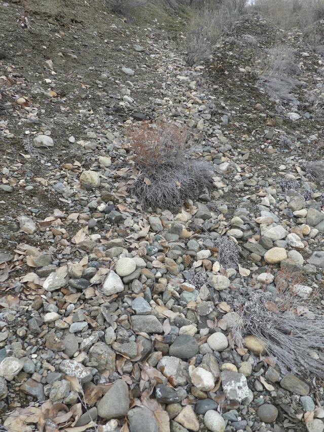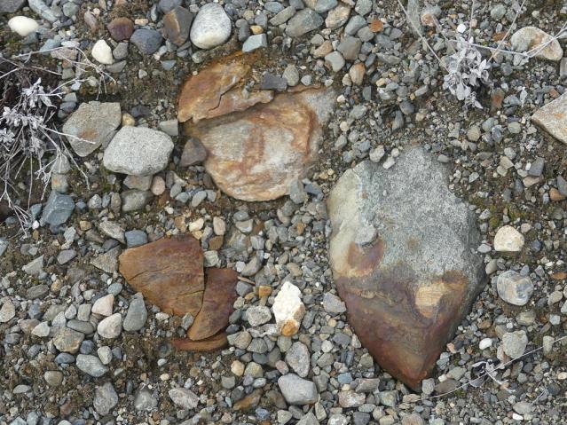 Look how jumbled these rocks are! That’s the Interior of the North of the Northwest for you: all kinds of crazy volcanic islands jumbled up together in splinters across a couple thousand kilometres north-south distance in a series of huge collisions, and then cut-and-diced by ice and moved by water. As you can see, over the fifteen years of exposure in this gravel pit, water and gravity have started moving rock again.