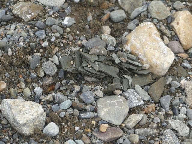 This is going on across the slope of a gravel pit cut into a post-glacial riverbed that ran high along a wall of ice high above the valley 12,000 years ago, for six months or so. How do we know it was only six months? Well, look at the rocks below. They are splinters, eroded by water but barely so. That’s perhaps about six months of tumbling: a quick fast river, not travelling far, and dropping its weight along the ice, probably at winter freeze-up.